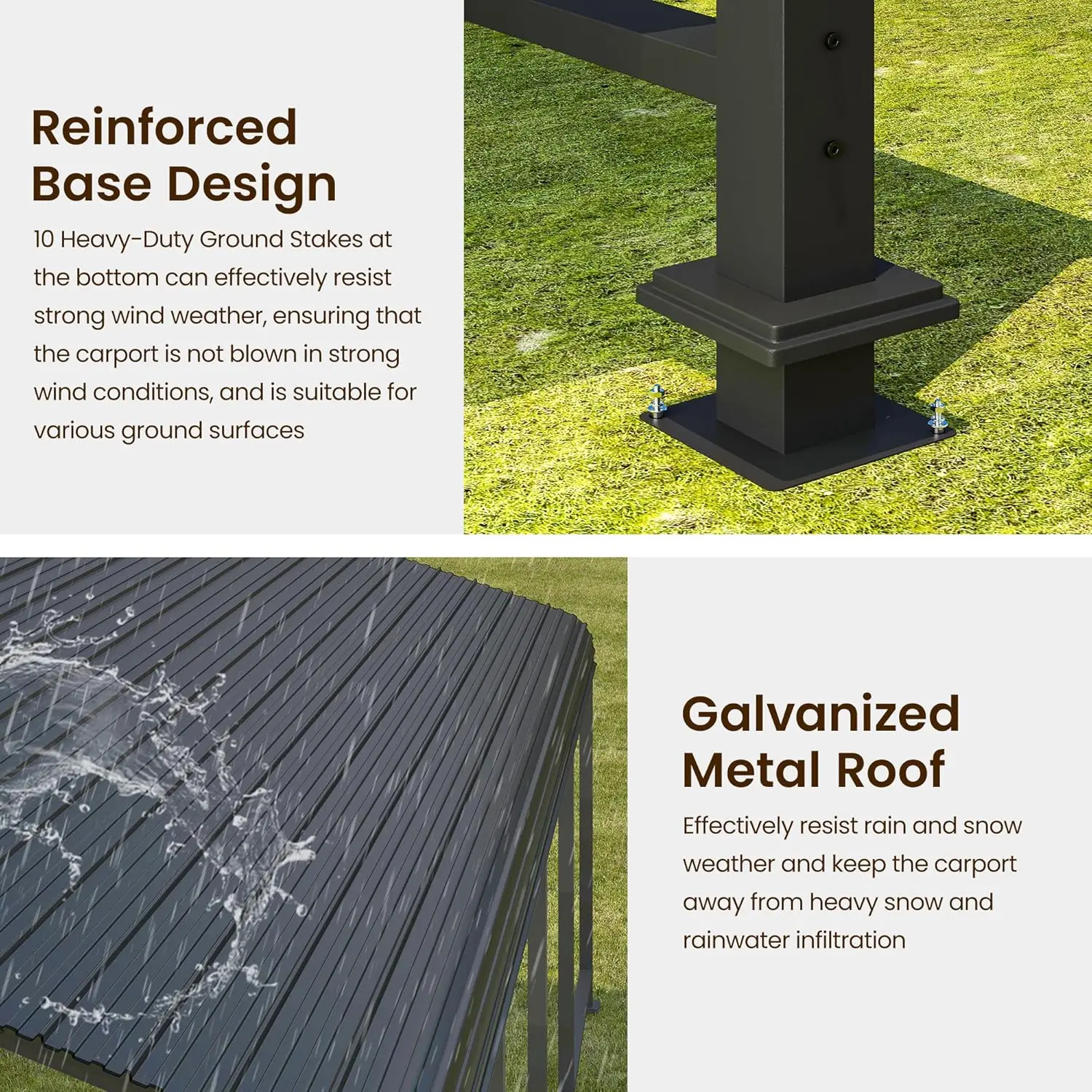 - 【Stable & Sturdy Galvanized Frame】The heavy-duty carport is manufactured using galvanized metal pipes and a piping contraction process, which compresses high-strength steel tubes, enhancing its resistance to bending. Both the top and bottom incorporate reinforced support beams, which increase overall stability, ensuring safety and reliability against wind.