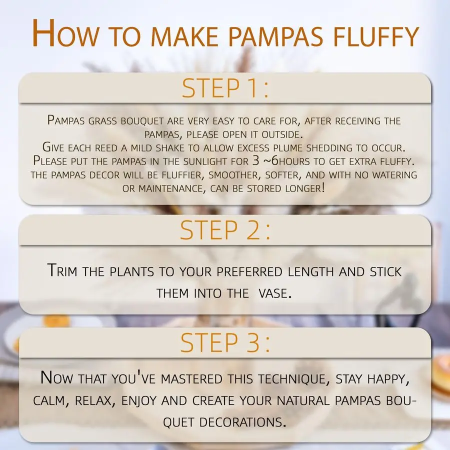 Warm tipsbefore bringing bouquet indoor, please take it out of the package carefully,give each reed a gentle shake,as it comes from nature, please accept that some of it will fall off.